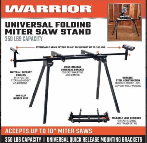 Soporte Universal Plegable Para Sierras De Hasta 10 PuLG.m WARRIOR Soporte para sierra ingletadora plegable de 350 lb para sierras de hasta 10 pulg. Este soporte plegable para sierra ingletadora soporta cargas de hasta 350 lb. Este soporte plegable para sierra ingletadora es compatible con la mayoría de las sierras ingletadoras de 10 pulgadas. Los brazos extensibles soportan más de 80 pulgadas de material y hasta 350 lb. Con una construcción de acero duradera que proporciona un soporte nivelado y resistente mientras se trabaja, rodillos convenientes para soportar el material, lo que facilita el corte de piezas grandes y un diseño plegable para facilitar su almacenamiento y transporte. La construcción de acero duradera proporciona un soporte nivelado y resistente mientras se trabaja Compatible con sierras ingletadoras de hasta 10 pulg. Diseño plegable para fácil almacenamiento y transporte. Prácticos rodillos para soporte del material, lo que facilita el corte de piezas grandes Los rodillos de parada positiva ayudan a prevenir cortes repetitivos. Los brazos extensibles soportan más de 80 pulgadas de material y hasta 350 lb. SKU(s) 56478 Marca WARRIOR Dimensiones plegado (LxWxH) 39 pulgadas de largo x 16-5/8 pulgadas/10-3/8 pulgadas de ancho x 9 pulgadas de alto Altura del producto 29-1/2 pulg. Longitud del producto 80 pulg. Peso del Producto 23 libras. Peso de envío 26,00 libras. Carga de trabajo 350 libras. Lo uso para cortar con sierra y me encanta. Suficientemente sólida, fácil de usar, no tiene ruedas, pero tengo otro soporte con ruedas que nunca uso. La sierra se separa del soporte con 2 palancas y el soporte se pliega hasta formar un paquete ordenado que es fácil de guardar o transportar. Sin garantía