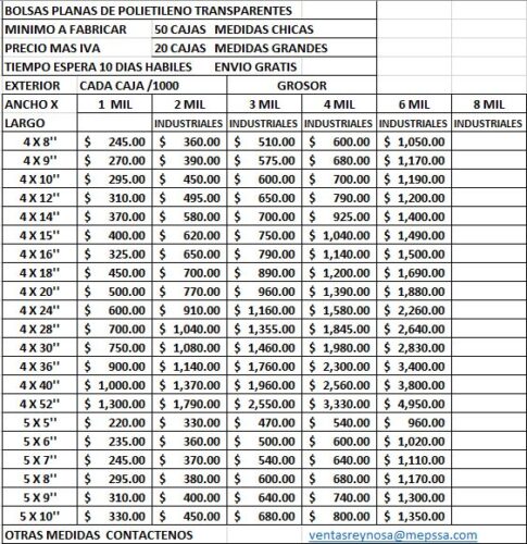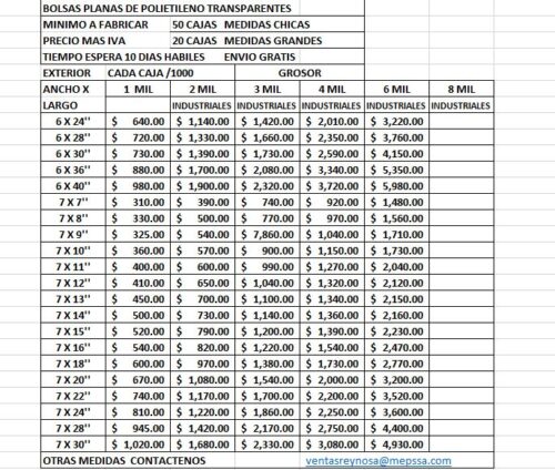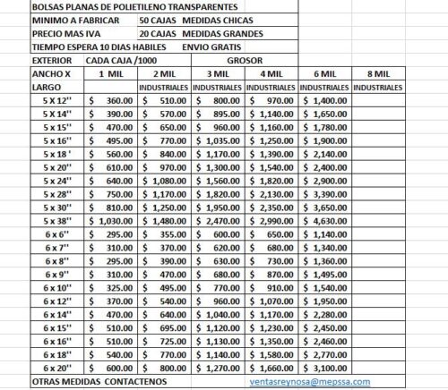 BOLSAS PLANAS DE POLIETILENO INDUSTRIALES VER IMAGEN CON DETALLE DE MEDIDAS Y PRECIOS