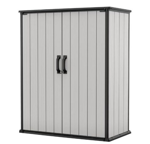 Cobertizo de almacenamiento exterior de resina Keter Premier Tall de 1,4 x 1,6 m con soportes para estanterías para muebles de patio, accesorios de piscina y bicicletas, gris y negro