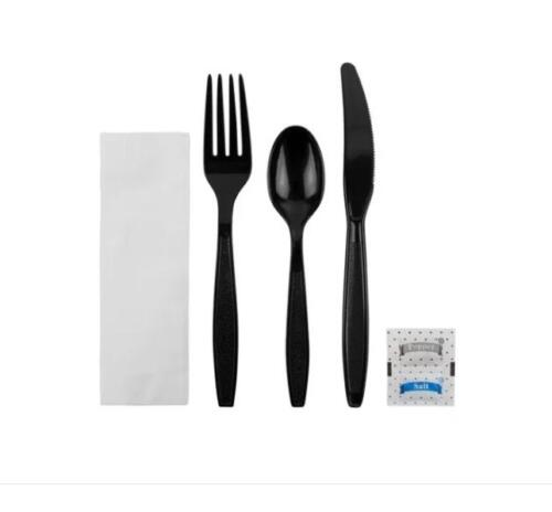 Los kits de cubiertos vienen en una variedad de opciones para que puedas enviar rápidamente a tus clientes comida para llevar con todo lo esencial. ¿Necesitas más que solo utensilios? Estos kits incluyen un sobre de sal y uno de pimienta para que los clientes puedan sazonar su comida al gusto. Cada kit viene envuelto individualmente en polietileno con un cuchillo, tenedor y cucharilla de PP negros de alta resistencia, además de una servilleta de una sola capa, un sobre de sal y uno de pimienta.