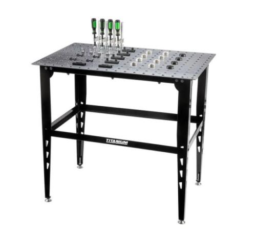 Esta mesa de soldadura modular TITANIUM™ de 91 cm x 61 cm con kit de montaje puede utilizarse como mesa de soldadura independiente. Incluye un juego completo de abrazaderas y bloques para un montaje preciso de las soldaduras.