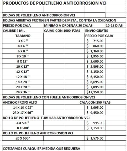 PRODUCTOS DE POLIETILENO ANTICORROSION VCI BOLSAS PLANAS ROLLOS